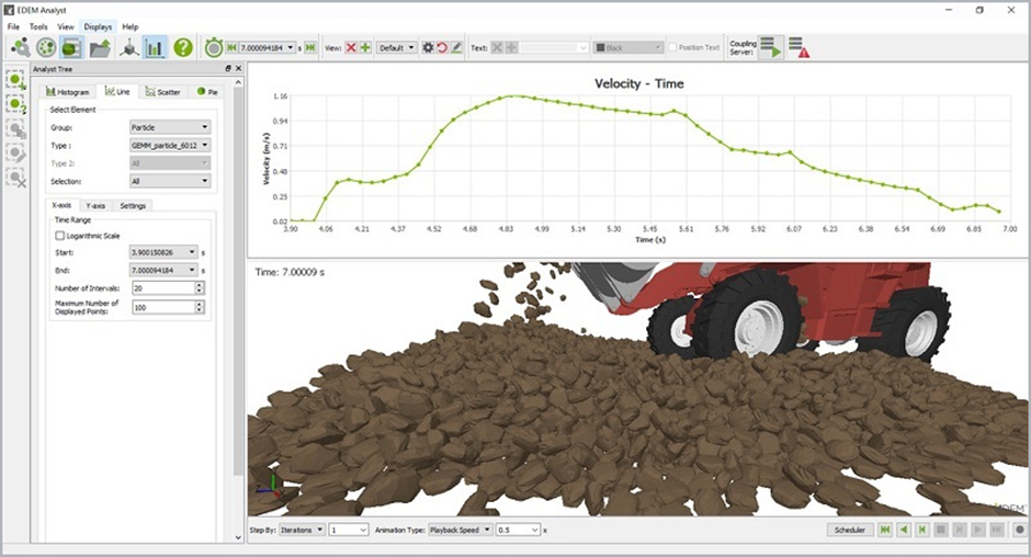 Além de prever o comportamento dos materiais, o EDEM pode ser integrado a ferramentas de dinâmica multicorpos, como o Altair® MotionSolve®, para modelar de forma abrangente as interações entre cultura, máquina e solo. Essa abordagem holística permite aos engenheiros simular a resposta do equipamento sob diferentes condições de operação, considerando a variabilidade dos materiais. Com essa integração, os profissionais são capazes de realizar otimizações mais precisas no design das máquinas, garantindo que elas funcionem de maneira eficaz em diversos contextos agrícolas.